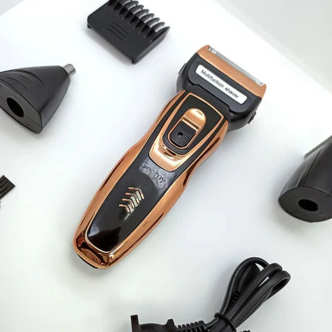Tres cabezales, un solo equipo Afeitadora de láminas, recortadora de barba y recortadora de nariz/orejas. Todo lo que necesitas en un diseño compacto y elegante.